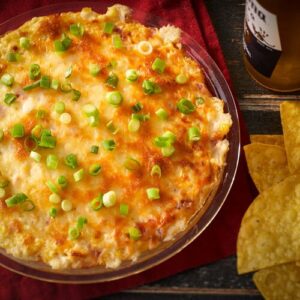 - Transfer to baking dish and top with remaining ½ cup cheese. Bake for 20-25 minutes until cheese has melted and the sides are bubbling. Garnish with chopped scallions and serve warm with tortilla chips.